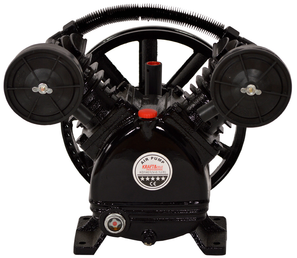 Compresorul de aer V-0.12 / 8 cu 2 pistoane produs de Kraft & Dele este lubrifiat cu ulei, si echipat cu o volanta, care în același timp răcește compresorul și radiatoarele laterale.